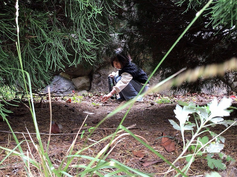 完成度がとても高い「写真作品」です。もう完全に、大人顔負けです。水平と垂直をしっかり取り、日の丸構図と二分割構図を組み合わせて写真そのものを安定させています。そのような写真撮影での大切な基本を押さえたうえで、手前にボケの草の葉、中位に上から垂れ下がる木の葉、奥に石垣と木々の緑を配置して奥行きを感じさせつつ、その中心にぽっかりと光のあたる空間を生み出して、作中の主人公の表情やしぐさを引き立たせています。まるで主人公が森のなかの虫や植物たちと会話をしているような「物語」を想像させられます。
