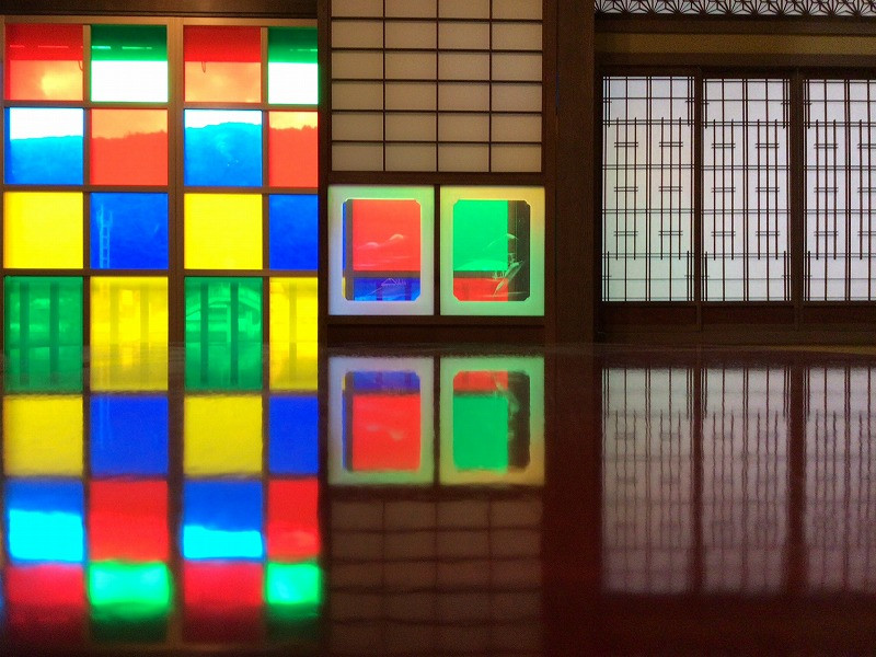 手前から、テーブル、反転で写る色と光と影、スリガラス、障子、ステンドガラス、手すり、山を背にした町の風景と、普通なら多すぎて混乱するはずの数多くの要素や情報や形を、構図として日の丸、二分割、対称、対比を高度に組み合わせることで、ひとつに一体化した美しい写真として表現しています。