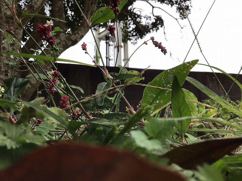ふだんは見ることのないような位置からものをとらえ、光や影で濃淡のある緑を全体的に配置し写真のイメージを安定させたうえで、枯れ葉の茶、花の赤、石垣の濃い灰色、鉄塔の灰色、空の薄い灰色と、少しずつ違う色を織り交ぜています。また、この写真に生き物は写っていませんが、虫食いの葉っぱをしっかりと見せることで、「生命が息づく空間」まで表現しています。