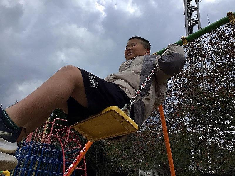 主人公の表情をのがすことなく、斜め下から遠近法で足と顔のサイズをふだんとは違うバランス感覚でとらえることで、ブランコをこぐ動きをダイナミックにとらえています。また、縦に伸びる鉄塔が空の高さを際立たせ、さらにあえて地面を見せないことで、ブランコをこいでいる動きの高さを表現しています。